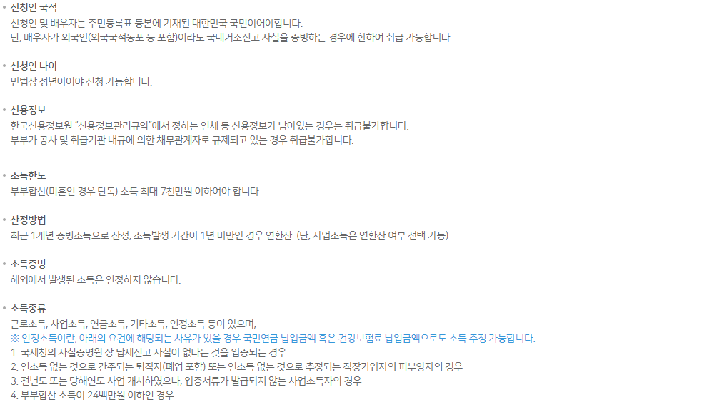부부(미혼의 경우 독신)는 총 소득이 7000만원 미만이어야 합니다. 소득은 가장 최근 연도의 소득 증명을 기준으로 계산되며 소득이 발생한 기간이 1년 미만인 경우 연간 환산합니다. 다만, 매년 영업이익을 환산할지 여부는 선택권이 있다.