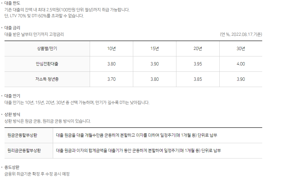 9월 15일부터는 담보로 하는 주택의 시가가 3억원 미만이면 신청할 수 있고, 10월 6일부터는 담보로 하는 주택의 시가가 4억원 미만이면 신청할 수 있다. 농협은행 담보대출 전환에 대한 자세한 사항은 농협은행 영업점 또는 농협은행 고객센터로 문의하면 된다.