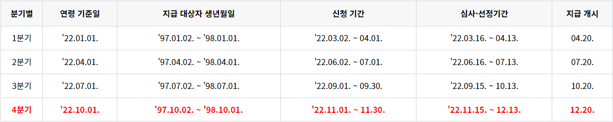 11월 1일부터 11월 30일까지 지원서를 접수하고 11월 15일부터 12월 13일까지 심사 및 선발을 실시합니다. 4분기의 경우 청년기본소득 지급일이 12월 20일부터다. 청년기본소득 신청마감 및 납부일은 1분기부터 4분기까지 신청 가능한 연도별 기준일과 상이하다.