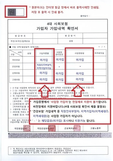 출력 버튼을 누르시면 아래와 같이 4대 사회보험 가입자 확인이 가능합니다. 인쇄하여 PDF 파일로 저장합니다.