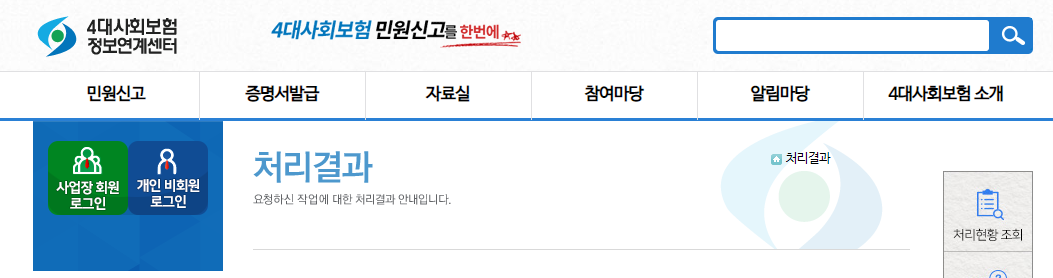 4대 사회보험 민원신고를 한번에! 사업장 및 개인회원의 전자민원신고, 가입내역조회 및 증명서 발급 민원을 신청하세요! 사업장 회원 로그인 개인 비회원 로그인