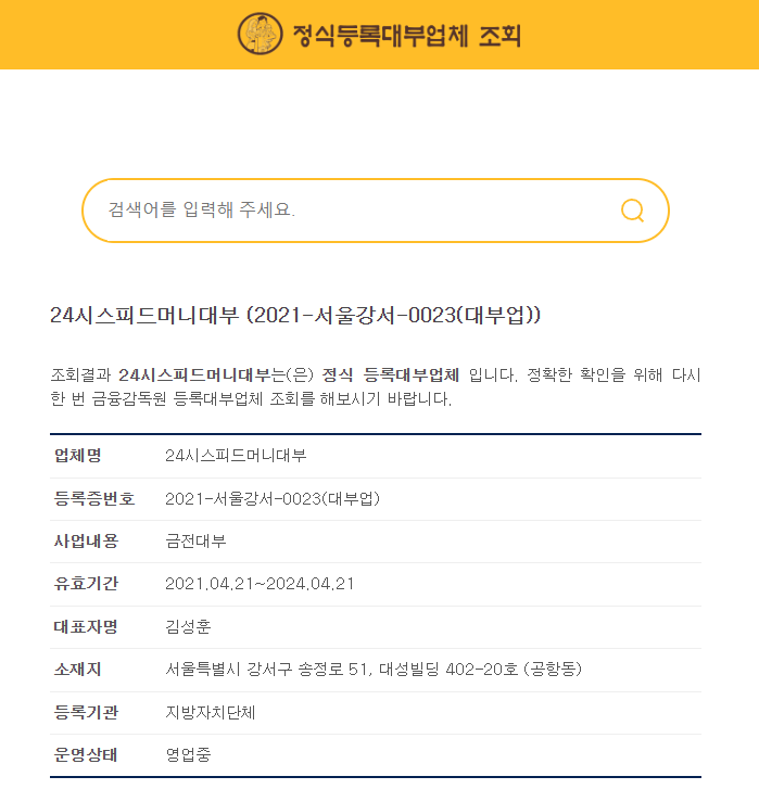 24시스피드머니대부 (2021-서울강서-0023(대부업)) | 정식등록대부업체 조회 (ellys.co.kr)