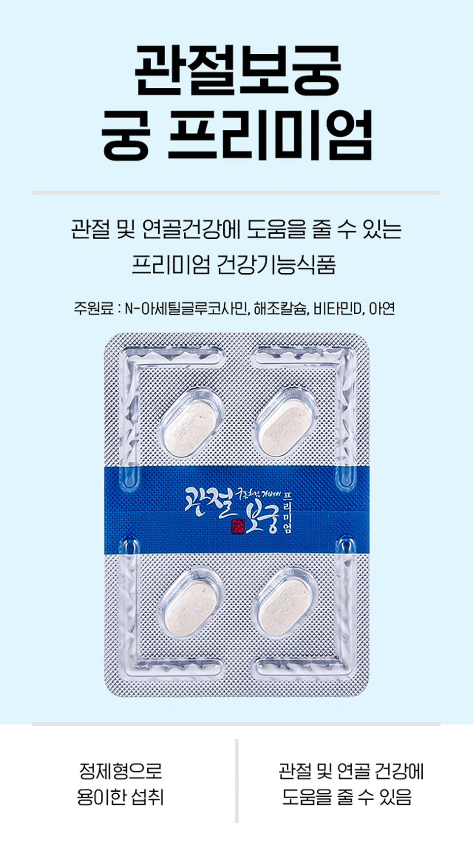 관절보궁에는 MSM (메틸설포닐메탄), NAG (N-아세틸글루코사민), 비타민D3혼합제제, 해조칼슘 등이 함유되어 있어요. 이 성분들은 관절 염증과 통증 완화, 피로 회복, 피부 보습, 뼈 강화, 관절 기능 향상에 도움이 된다고 알려져 있죠.