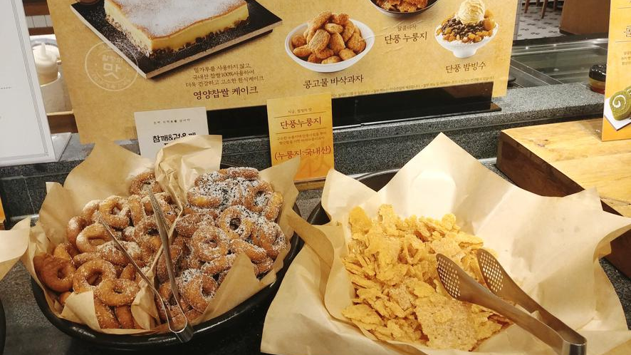 제가 너무 좋아하는 도넛, 그리고 콩고물 바삭 과자도 있고 단풍 누룽지와 단풍 밤 빙수도 있고 누룽지는 아삭아삭해서 과자처럼 먹으면 너무 맛있어요. 이거는 디저트 먹고 하나 두 개씩 먹어도 되게 맛있더라고요.