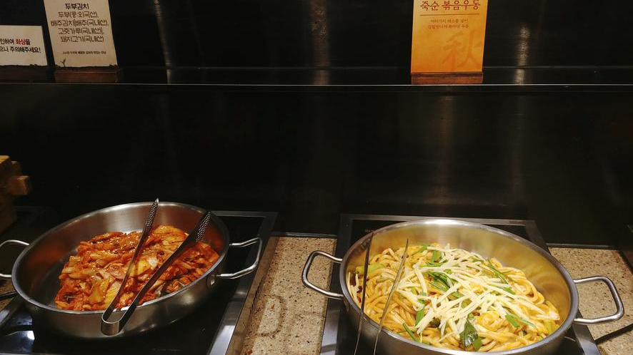 한식에는 찌개도 빠질 수 없는데요. 보시다시피 이게 새우가 듬뿍 들어가 있어요. 그래서 되게 얼큰한 새우탕면을 먹을 수 있습니다. 이거는 맨 마지막에 먹으면 좋아요. 아니면 다른 메뉴들 먹으면서 같이 먹기에도 좋아요. 찌개가 없으면 안 되잖아요. 다양한 해산물도 먹을 수 있고 밥이랑 먹기에도 너무 좋고, 새우탕면에는 면도 많이 들어있어요.