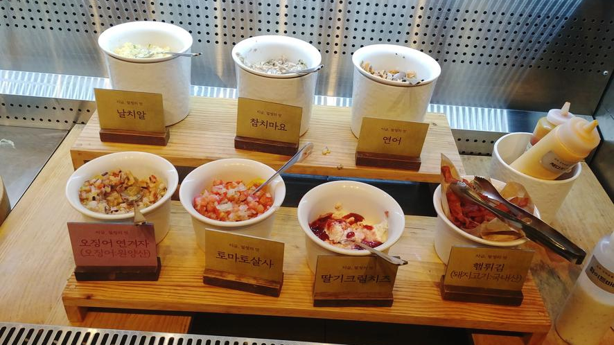 연어 큐브나 오징어 연겨자, 화이티 바비큐, 토마토 살사, 체다치즈, 특제 고추장 케첩 등을 다양하게 함께 먹을 수 있고 특히, 오징어 연겨자는 10월 신메뉴입니다.