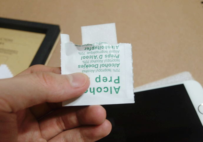 이 티슈로 슥슥 닦아주고 물기를 모두 제거합니다. 깨끗이 제거해야 얼룩 및 기포가 생기지 않습니다. 이제 IFC 풀커버 강화유리 필름을 붙일 거예요, 천천히 섬세하게 필름을 옮겨봅시다!