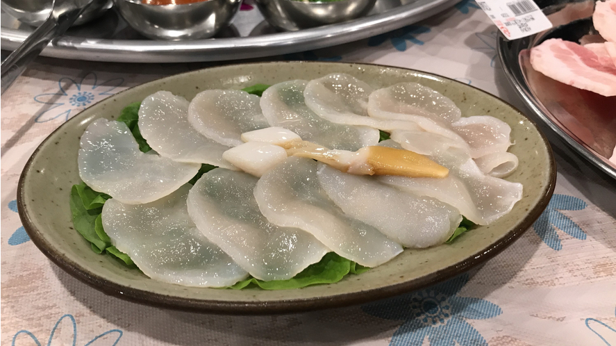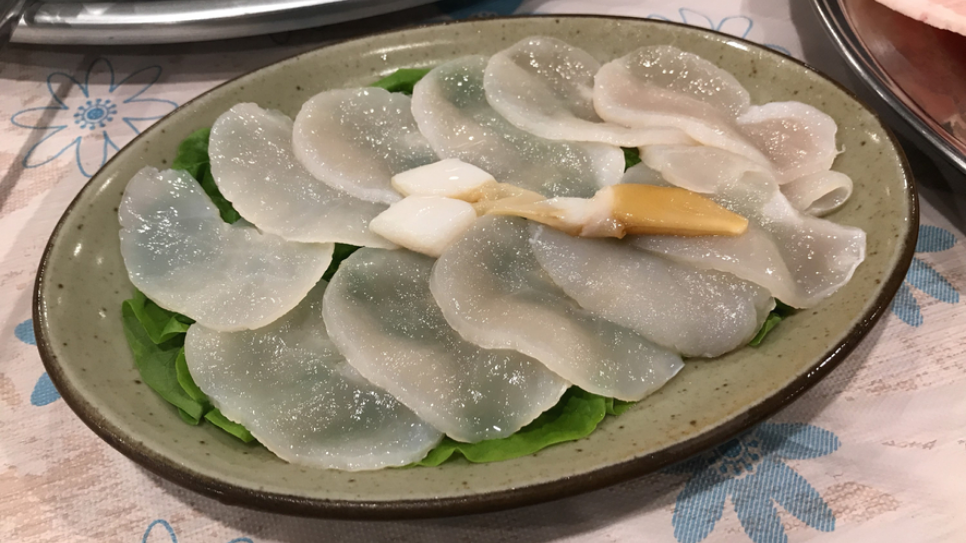 이게 바로 키조개관자입니다. 투명하고 말랑말랑해서 약간 얇은 수제비 같기도 하죠! 키조개관자도 조개구이랑 비슷한 것 같아요. 정말 먹어본 기억이 별로 없을 정도로 자주 못 먹는 음식 특히, 아마도 고기집에서는 처음 먹어본 것 같은데요. 조개구이를 먹으려면 을왕리해수욕장을 가면 좋아요!