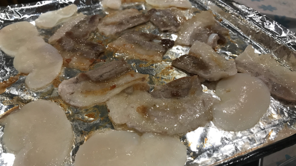 삼겹살에서 구워지는 기름에 키조개관자도 부드럽게 구워집니다.