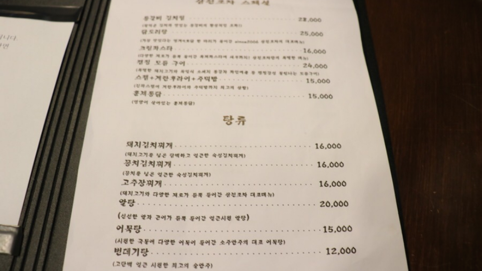 삼전 포차 스페셜과 탕류가 적혀있는 이곳의 메뉴판입니다. 메뉴판은 쓱 보시면 되겠습니다. 가장 인상적인 메뉴는 역시 등갈비 김치찜과 닭볶음탕입니다. 소주와 가장 잘 어울리는 안주라고 생각이 듭니다.