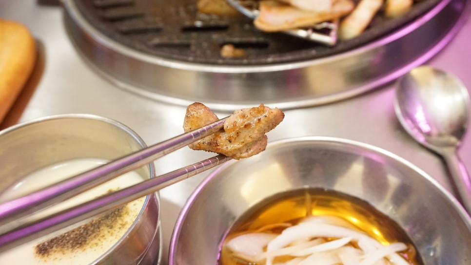 불판 마음에 들었네요. 고기 기름이 아래로 빠지게 저렇게 해둔 것도 마음에 들었네요. 저도 식당을 정말 많이 다녀보니까 식당을 운영하지 않아도 이런 불판 같은 것만 봐도 대충 느낌이 옵니다.