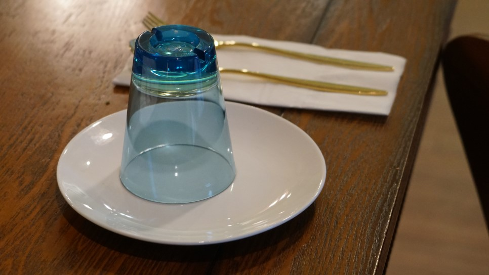 깔끔하고 심플한 접시와 투명한 유리컵, 금빛 식기가 세련된 느낌을 줍니다. 묘한 느낌의 식당이라서 더 기대를 많이 하게 되는 것 같아요. 인테리어만 번지르르한 그런 식당이 아니라 정말 눈이 즐겁고 입이 즐거운 그런 식당은 좋아할 수밖에 없죠! 뭔가 프랑스라고 하면 로맨틱한 느낌이 나는 것 같아요.