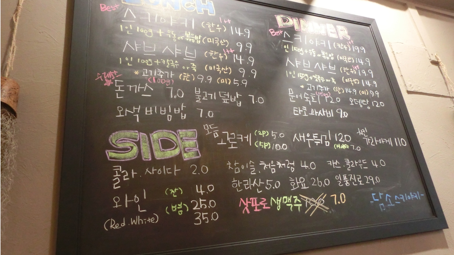 식당 앞에 주차할 곳이 마땅치 않아서 근처 공영주차장에다가 주차 하고 걸어왔습니다. 런치타임이랑 디너 타임으로 되어 있는데요. 저희는 디너타임때 방문했어요. 스키야키랑 샤브샤브로 되어 있었고 고기같은 경우에는 1등급 한우를 사용하고 있는 곳입니다. 고기가 정말 맛있더라구요.