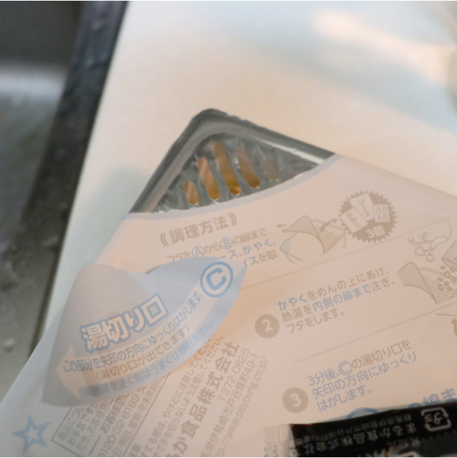 끝에 이렇게 물을 쉽게 버릴 수 있게 표시되어 있어요. 이런 세세한 부분까지 정말 아이디어네요. 보통 불닭볶음면이나 다른 면 음식들은 봉투를 뜯거나 젓가락으로 구멍을 내서 버리는데 말이예요.