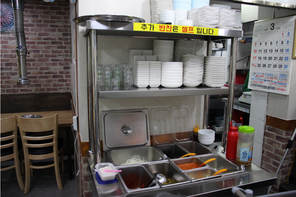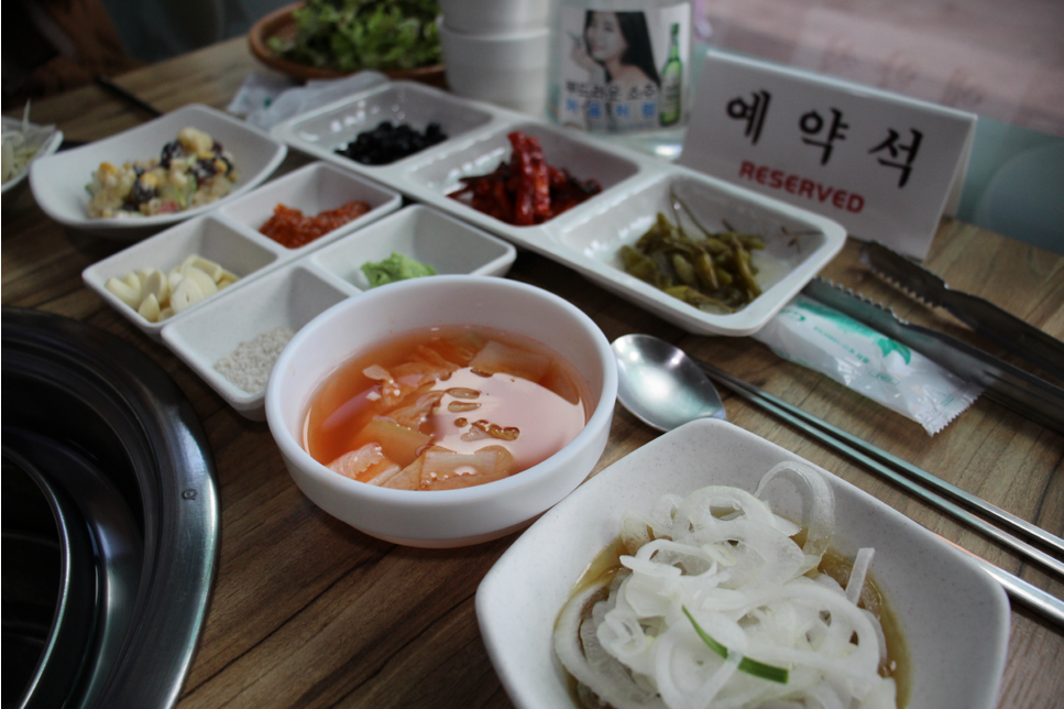 저희는 맛있는 고기를 먹으러 일단 자리에 앉았습니다. 비어져 있는 자리에 앉았고 가볍게 주문을 시작해봅니다. 이베리코 흑돼지 일단은 이베리코 흑돼지가 맛있어 보이니까 먼저 주문하고요. 참, 여기 반찬은 처음 세팅을 해주시는데요. 그다음부터는 여기 셀프바에서 리필하셔서 마음껏 드셔도 됩니다.
