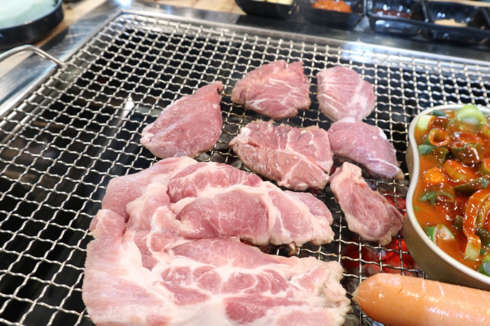 그리고 삼겹살을 구워요! 삼겹살은 국내산 암퇘지 냉장을 사용하기 때문에 누린내 없이 담백하답니다! 아참, 그리고 소시지도 수제라고요! 각종 소스에 취향에 맞게끔 찍어먹고요.
