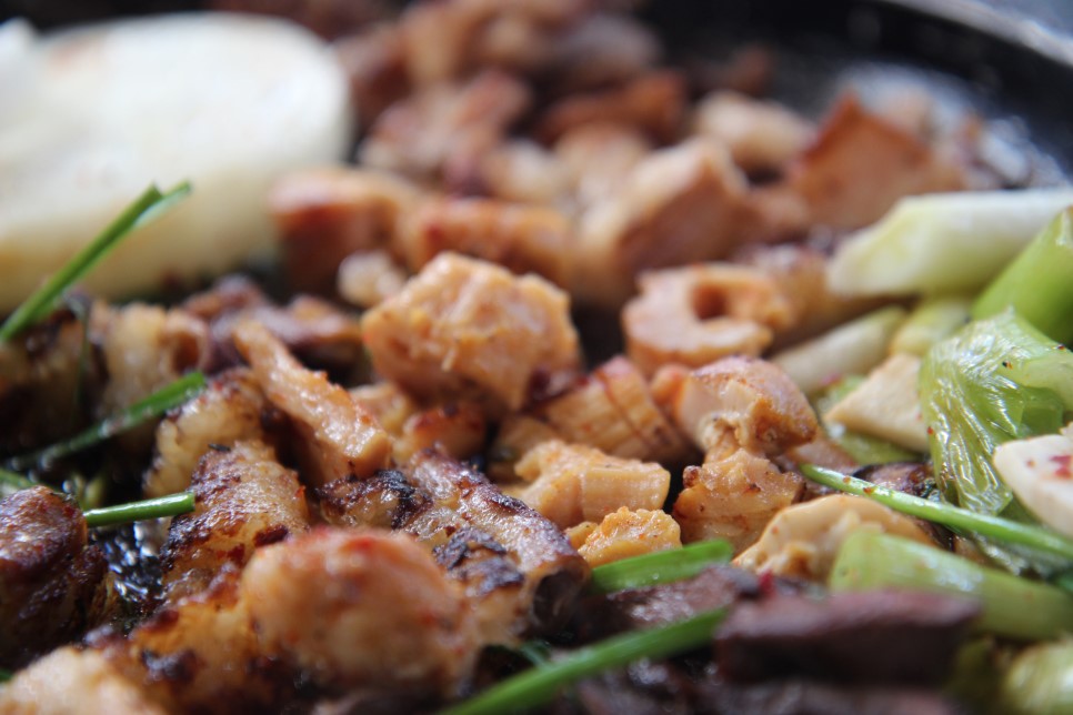 볶음밥은 붉은 양념이 들어가는데 안에 부추를 잘게 썰어서 같이 볶아먹으면 된다! 고루고루 비빈 다음에 숟가락으로 누룽지 만들기 위해 꾹 꾹 눌러서 익혀먹기 그리고 어느 정도 시간 지나면 숟가락 뒤집어서 쓱쓱 긁으면 밑바닥이 꼬들꼬들하게 누룽지가 된다!