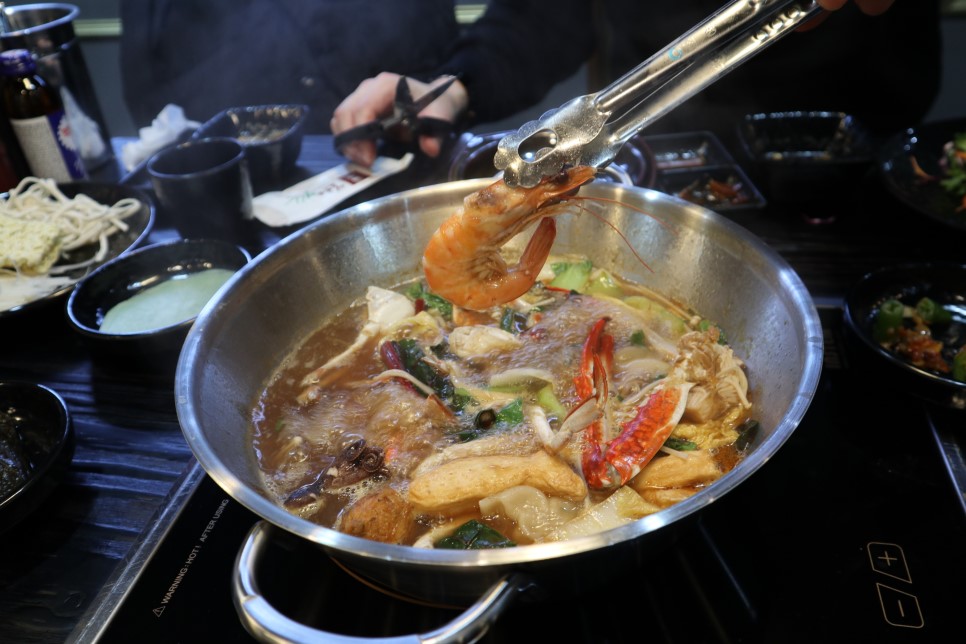 편백 찜을 정말 맛있게 먹었어요. 고기의 식감도 부드러워서 남녀노소 아이 어른 누구나 먹어도 부담 없는 식감과 맛이었습니다! 샤부샤부! 편백 찜을 익히면서 아래로 떨어졌던 고기 육즙이 샤부샤부 순한 맛 육수와 만나면서 더 깊고 맛있는 육수 맛으로 변신했어요! 해물을 넣고 끓이는데, 육수가 조금 모자라서 순한 맛 육수를 추가로 넣었습니다.
