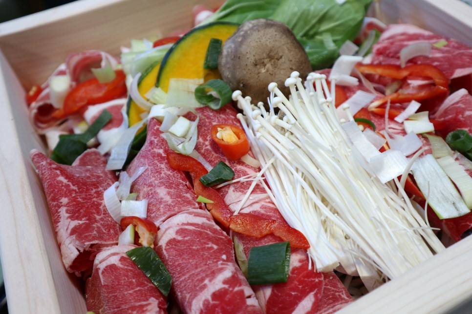 음, 그런데 테이블에 편백 찜 뚜껑 같은 게 있어서 열어봤어요. 진심 편백 찜인가, 생각해서 열어봤는데 샤부샤부용 육수같더라구요. 편백 찜이랑 샤부샤부랑 같이 먹는구나 라고 생각했는데 직원분께 여쭤보니 편백 찜을 다 먹고 나면 고기에서 나오는 육즙이 샤부샤부 육수 안으로 들어가서 깊은 고기육수 맛이 된다고 하더라고요!