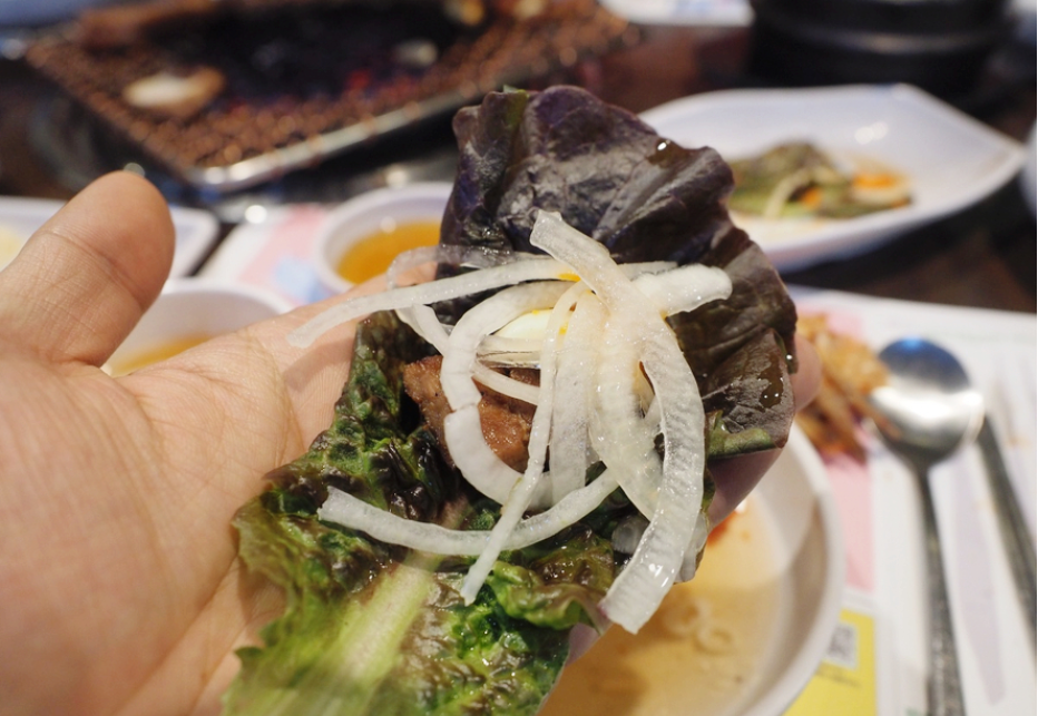갈비가 맛있게 구워졌으니 이제 본격적으로 먹기 시작합니다. 제가 쌈무를 정말 좋아하는데 쌈무와 깻잎을 같이 곁들여 먹으면 맛있다고 추천해주셔서 알려주신 방법 대로 먹어봤는데 향긋한 향기와 고기의 담백하고 숯불 냄새 가득 베긴 냄새가 입안과 코에 가득 퍼지는데 이게 바로 힐링이구나 싶더라고요. 힐링. 멀리 가지 않아도 된다는 걸 보여주는 곳인 것 같아요