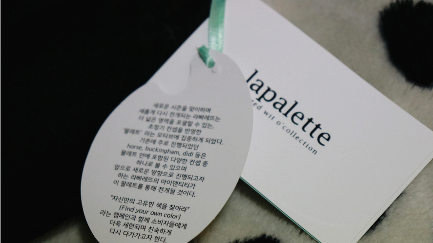 제품 설명서가 포함되어 있어요. 상표와 라벨에 라빠레뜨만의 아이덴티티가 그려져있습니다. 대학생 분들이 사용하기에 좋은 라빠레뜨 에코백 쥬이백
