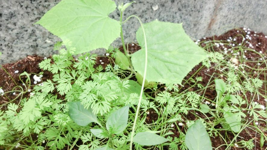 그리고 이건 오이예요. 흰가루병때문에 오이가 진짜 다 죽었는데 한 3개 정도 남아있어요. 오이 정말 잘 키우고 싶었는데 병에 걸리기 쉬운가봐요. 병에 걸린 아이들은 잎이 썩어나가고 줄기가 힘이 없어서 픽 쓰러졌었거든요. 아직 너무 울창해서 솎아내기를 더 해야하는데요. 솎아내기를 조금 더 쉽게 하는 방법을 생각해보고 있어요. 손으로 뽑으니까 다른 건강한 식물도 뽑아내기도 하게 되더라구요.