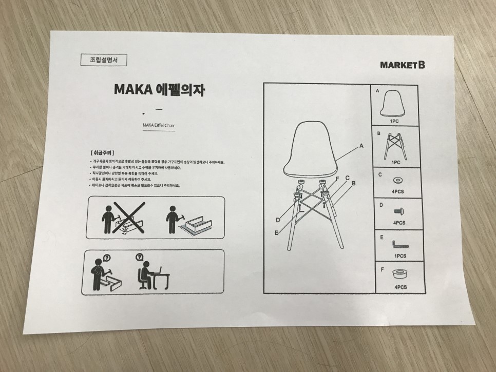 디자인은 정말 예쁘지만, 저렴해서 그런지 약간의 기능적인 문제가 없는 하자가 발견되었다. 그래서 조금 속상해서, 일단은 문의글에다가 남겨놓은 상태! 가격은 24,430원이고, 디자인은 깔끔, 마켓비 MAKA 에펠 의자라고 한다.