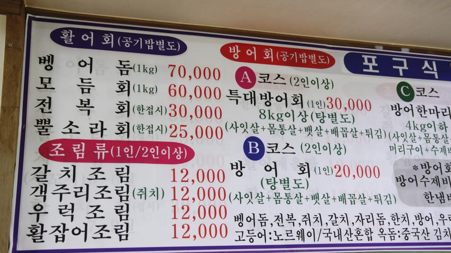 식당 내부로 들어가면 가장 먼저 메뉴판이 보입니다. 메뉴판에서는 여러 가지 메뉴를 먹어볼 수 있는데요. 참고로 방어회 주문할 때 방어 수제비 지리 또는 매운탕 한 냄비를 만원에 먹어볼 수 있습니다.