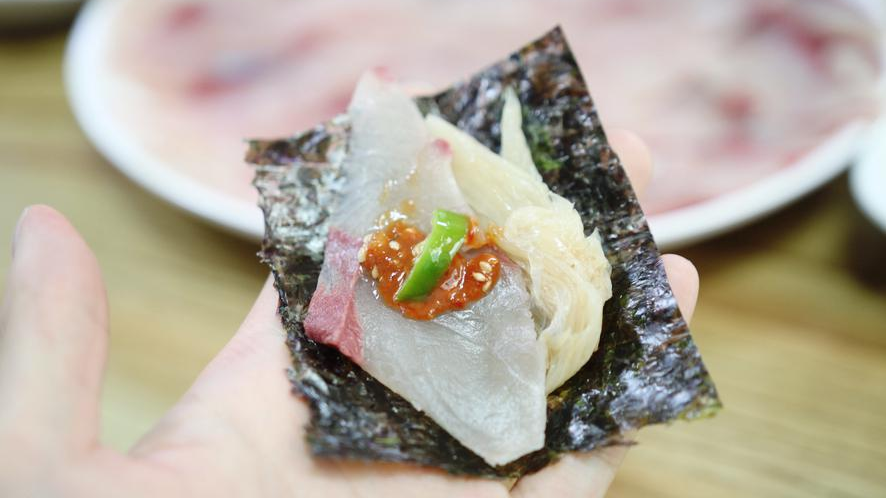 방어회 진짜 맛있답니다. 일본에서는 주로 회를 먹을 때 초장 없이 간장이랑만 먹거든요. 또 한국에서 광어회나 우럭회 등을 먹을 때 초장을 듬뿍 찍어서 먹었는데요. 여기서는 김이랑 싸서, 배추 조금, 썰은 고추 조금 초장 조금 이렇게 해서 싸서 먹었어요.