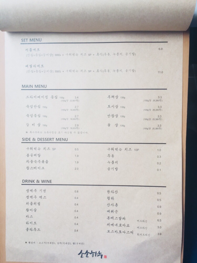 메뉴판은 뭔가 되게 소박해요. 여기는 메뉴판이 소박해서 소소하누인 것 같아요. 놀라움의 연속! 남녀노소 즐길 수 있는 메뉴판 구성이고 아이들이 먹을 수 있는 메뉴들도 많이 있습니다. 훨씬 깔끔하고 위생적이면서도 맛있는 고기를 즐길 수 있어서 여기 신뢰감이 엄청 팍팍! 요즘 식당 위생적인 얘기가 하도 많아서 정말 꼼꼼히 보고 먹는데요.