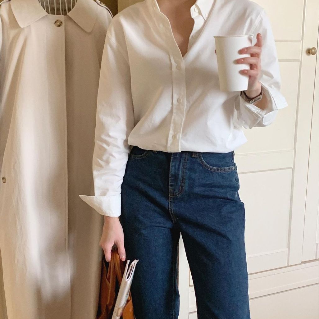 인디고 물감의 감색과 흰 실의 능직 무명(6~8온스)에서 만들어진 작업용 셔츠를 한다.