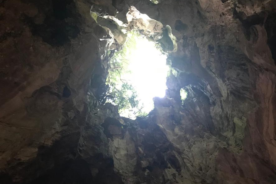 이 동굴에서는 이렇게 천장이 뻥 뚫려있어서 그 틈으로 해서 빛이 들어오는데 되게 멋있었어요. 나무줄기가 천장에서 조금씩 내려오고 있었는데, 오랜만에 자연과 함께 해서 더욱 즐거웠던 오행산 투어! 마치 이곳 천장을 통해서 하늘에서 천사가 내려올 것 같은 그런 기분도 들었어요.
