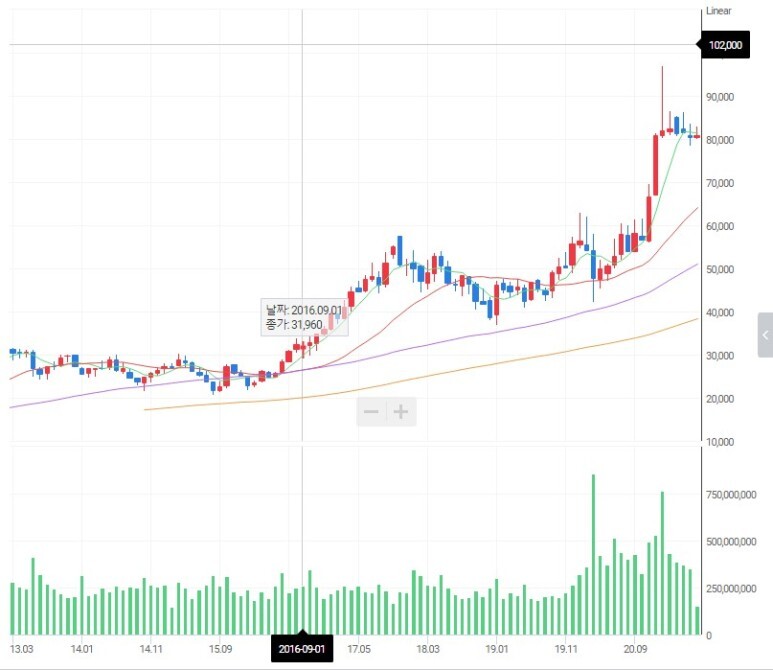 13년부터 16년까지 등락률 거의 차이가 없다가 16년부터 터졌다. 이때 삼성전자가 터진 것이다. 그러다가 17년 후반기에 고점찍고, 조정 받고 다시 상승한다. 그러다가 21년에 다시 한번 터졌다. 현재가 81,000원 그리고 삼성전자 매수하는 사람들은 10만전자를 고대하고 있다.