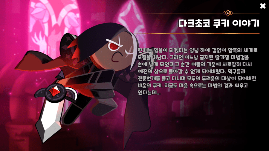 그러던 어느 날, 저는 금지된 딸기잼 마법검을 손에 넣었고, 그 순간, 저는 어둠의 에너지에 사로잡혀 예전 삶으로 돌아갈 수 없었습니다. 먹구름과 천둥 번개를 몰고 다니면서 모든 사람들의 공포의 대상이 된 불행한 쿠키입니다. 당신이 마음속에서 마법의 검과 싸우고 있다고 들었어요.